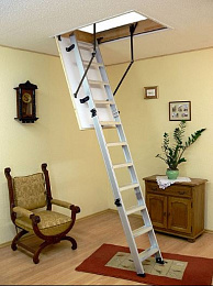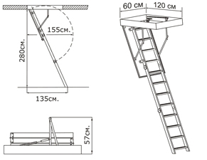 Лестница складная трехсекционная. Рабочая поверхность полностью выполнена из алюминия. Термоизоляционная крышка типа "сэндвич" толщиной 47 мм, имеет усиленную теплозащиту, облицована с двух сторон ДВП белого цвета. По контуру короба имеется уплотнитель. Все металлические элементы лестницы покрыты порошковой краской.